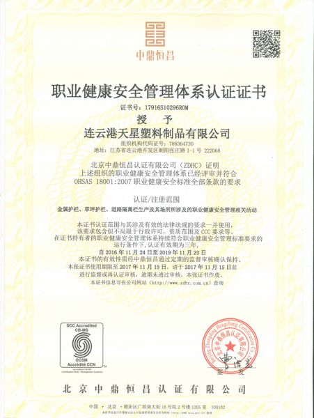 职业健康安全管理体系认证证书